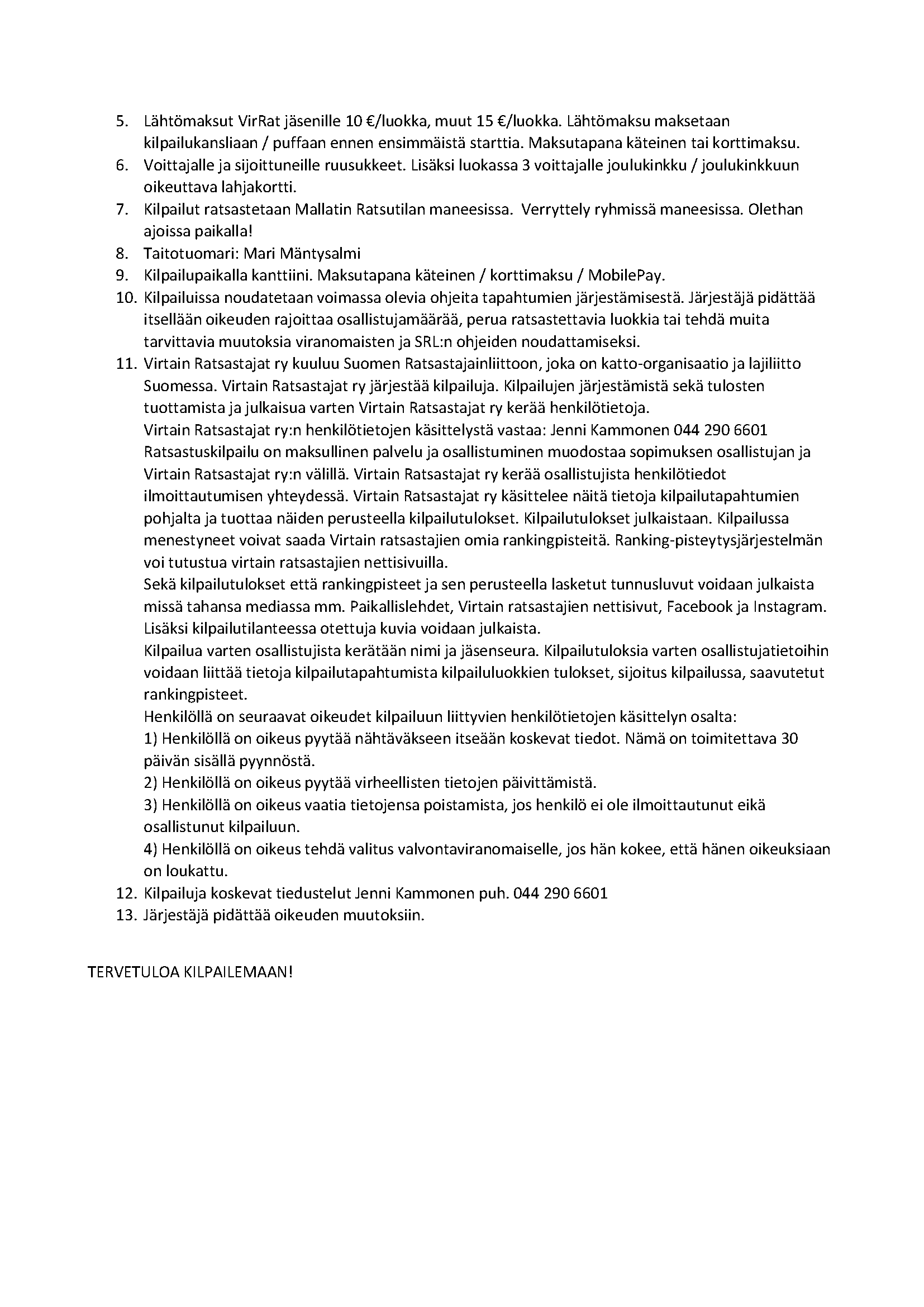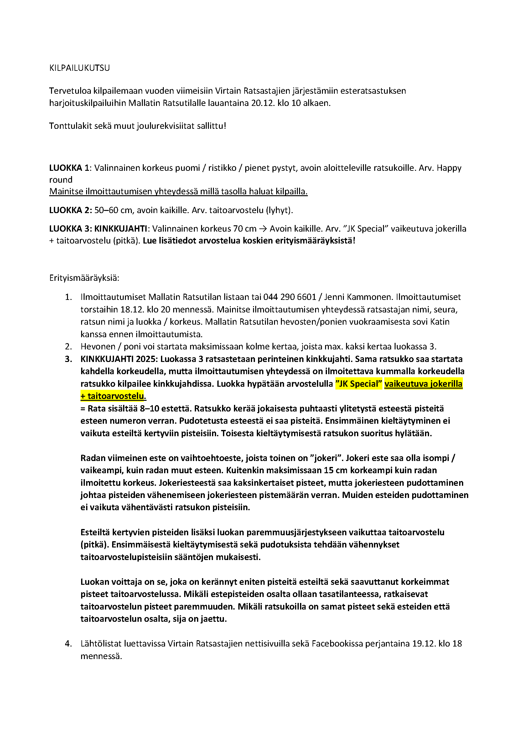 Kilpailukutsut, Kilpailut, Yleinen Esteratsastuksen harjoituskilpailut, Kinkkukisat 20.12.2025 7.12.2025 7.12.2025 Esteratsastuksen harjoituskilpailut 1.11.2025 – TULOKSET